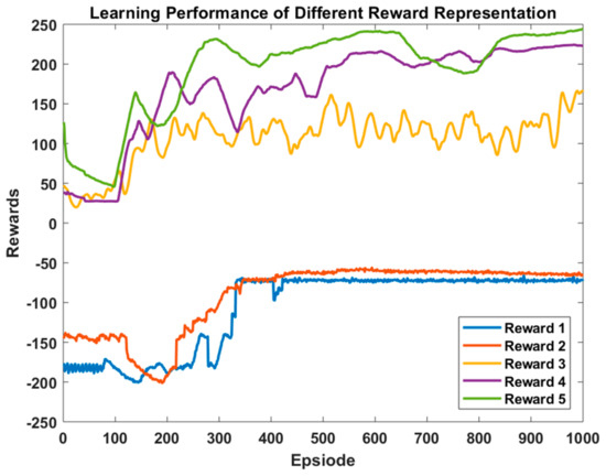 Besides the hyperparameters configuration, the formulation of the reward function significantly impacts the agent’s learning performance and is considered a major task in developing RL algorithms. Due to the sensitivity of the learning performance of the DRL agent towards the reward and penalty representations, we hereby analyze and compare the learning performance of adopting several total reward function representations. The penalty formulations , , and in (5), (6), and (7), respectively, are fixed, and the reward formulation is varied. The total reward representation is then calculated as in (8). For the analysis of the reward representations, the ORPD hyperparameters in Table 3 are employed, and the value of the constants N, M, and G are adjusted for each representation. The studied reward representations are presented in Table 4, and the DRL agent learning performance concerning each reward formulation is plotted in Figure 7.