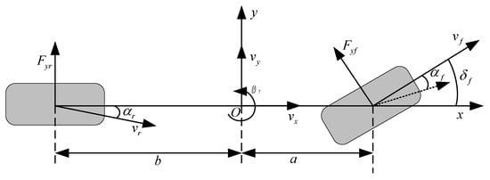 where is the longitudinal speed of the vehicle; is the yaw rate; is the sideslip angle; and , respectively, represent the total lateral force of the front and rear tires; is the mass of the entire vehicle; is the moment of inertia about the z-axis; and are the distances from the center of mass of the vehicle to the front and rear axles, respectively; is the front wheel angle; and is the additional yaw moment.