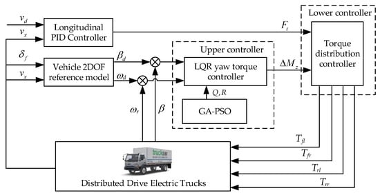 In recent years, there has been a growing demand for electric trucks in the heavy-duty truck industry due to increasing environmental requirements and restrictions on traditional fuel vehicles. The power system layout of electric trucks can be classified into two categories: centralized and distributed [1]. Traditional centralized drive electric trucks typically utilize a single motor to control the movement of the entire vehicle. On the other hand, distributed hub motor-driven electric trucks mount the drive motor on the wheel rim, directly powering the wheels. This design enables independent control of the driving torque for each wheel, resulting in higher response accuracy and faster power system response speed [2,3,4]. Through the installation of motors on each wheel, this distributed solution significantly increases the unsprung mass of the entire vehicle. As a result of this increase in unsprung mass, the vehicle may encounter more pronounced bumps and vibrations when driving over uneven road surfaces, thus compromising ride comfort. Moreover, the augmented unsprung mass can negatively influence the vehicle’s road grip, potentially resulting in reduced handling performance. By strategically arranging the output torque of the hub motor, an external yaw torque can be generated and applied to yaw motion control, thereby enhancing the stability of the vehicle. Consequently, the development of appropriate yaw stability control strategies has become a current research focus.