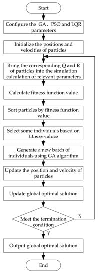 The GA-PSO algorithm is a combination of the Genetic Algorithm [29] and Particle Swarm Optimization [30]. The Genetic Algorithm is an optimization algorithm that simulates the process of biological evolution to find the optimal solution. On the other hand, Particle Swarm Optimization is an adaptive algorithm that simulates the movement and interaction of particles in the search space to find the optimal solution. The GA-PSO algorithm integrates the crossover and mutation operations from the Genetic Algorithm and incorporates the speed and position update concepts from Particle Swarm Optimization. By combining these two algorithms, we can leverage their respective advantages and better address optimization problems. The algorithm flowchart for applying GA-PSO to optimize the LQR weight matrix is presented Figure 3.