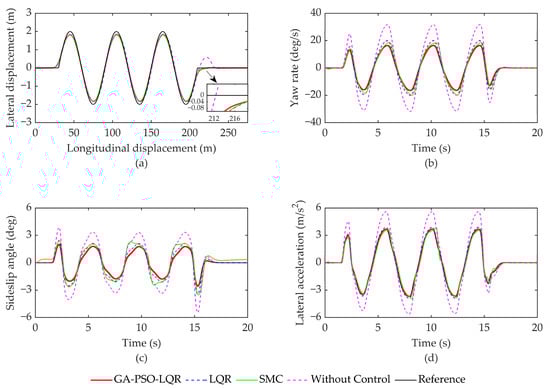 Simulation results of s double lane change working conditions. (a) Track position; (b) Yaw rate; (c) Sideslip angle; and (d) Lateral acceleration.