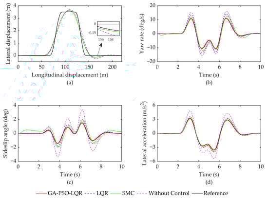 As illustrated in Figure 4a, in the absence of control, the error significantly increases at locations with notable changes in path curvature. The other three control strategies, namely, LQR and SMC, can ensure that the vehicle follows the intended trajectory. However, the GA-PSO-LQR algorithm exhibits the least path deviation compared to the other strategies. Figure 4b illustrates that the yaw rate of the vehicle experiences significant changes Without Control. With the addition of the controller, the yaw rate can be controlled within 20 deg/s. The GA-PSO-LQR controller proposed in this study demonstrates yaw rate control effects 17.2%, 17.6%, and 48.1% better than SMC, LQR, and no control, respectively. Additionally, the root mean square (RMS) has been optimized by 14.9%, 17.5%, and 48.0%, respectively. The controller presented in this article ensures better stability during vehicle operation.