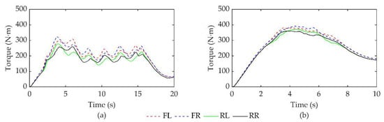 Torque of four wheels under two working conditions (GA-PSO-LQR controller). (a) Serpentine working condition. (b) Double lane change working condition.