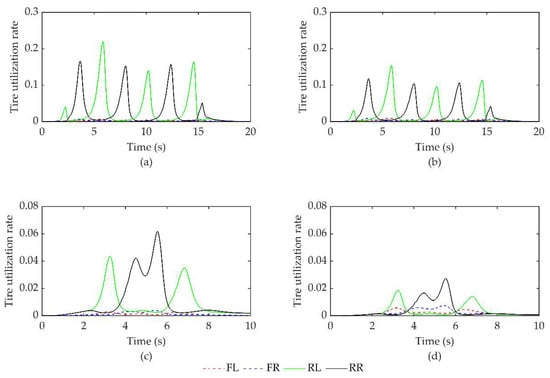 Tire utilization rate under two working conditions. (a) Equal distribution under serpentine working conditions. (b) Optimized distribution of serpentine working conditions. (c) Equal distribution of double lane change working conditions. (d) Optimized distribution of double lane change working conditions.