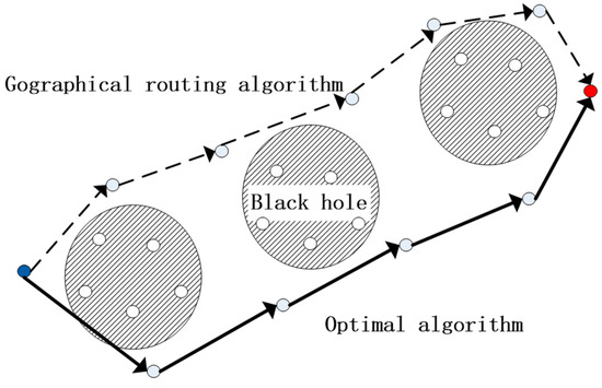 As WSNs are increasingly being applied in various real-world scenarios, the reliability of these networks has become a key concern. Therefore, the robustness of a routing algorithm is an important performance metric to consider, alongside factors such as energy consumption and communication delay. In high-risk environments such as petrochemical plants, a leakage incident can potentially lead to explosions. Sensor nodes are constantly at risk of failure, which can result in the formation of a “black hole”. Although algorithms such as Two-Phase Geographic Greedy Forwarding (TPGF) can partially bypass these holes, they are often prone to becoming stuck in local minima, as illustrated in Figure 1. Excessive node failure necessitates each node to repeatedly search for new paths, resulting in energy wastage.