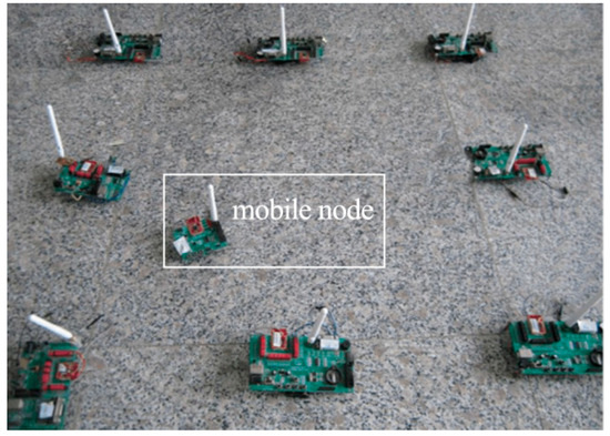 A series of actual field deployment experiments were conducted to verify the feasibility of the method proposed in this thesis. Due to limitations in the number of available sensors and the conditions of the experimental field, a total of 26 wireless sensors were utilized, with one serving as a sink node and another as a mobile node. For the beacon nodes, DMHS and other reference protocols were implemented using the TinyOS platform. Figure 4 displays a portion of the experimental setup. We arranged 24 of the beacon nodes outdoors, where the nodes were not exactly in the same plane in order to simulate the real environment as much as possible, and the batteries of the nodes were randomized and not purposely filled for them. The sink node was positioned at the network’s edge to mimic a large multi-hop sensor network, enabling testing with fewer sensors. It is important to note that all nodes were operated without antennas during the experiments, and the communication radius was approximately 10 to 15 m. If antennas are added, the sensor network can be deployed over a much wider range.