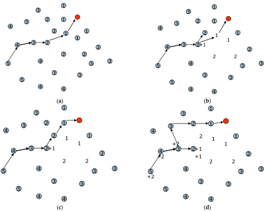 In order to visualize the routing process, we drew a schematic diagram based on the actual results, as shown in Figure 5. In this network, the sink node is represented by a solid black circle, and each node’s minimum hop distance to the sink is indicated by the number within its circle. Suppose a node is transmitting data with a hop count of 5, following the gradient of minimum hop counts shown in Figure 5a.