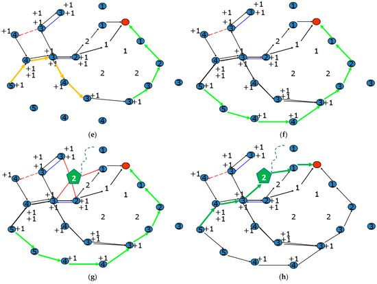 Now let us consider the case where there are mobile nodes patching the network. In extremely harsh environments, such as a bombing disaster, it is possible that all the paths in the network fail, and it is necessary to use an unmanned aerial vehicle or a robot to transport new nodes to patch the network. We place mobile nodes at the edges of the network as shown in Figure 5g, where the mobile nodes are represented by blue pentagons. Through the joining and exiting mechanism described above, the mobile node will publish broadcast frames to notify the surrounding neighboring nodes to dynamically update the hop count. After a similar process as above, a new green path is finally established as shown in Figure 5h. Of course, this path may eventually run out of energy due to the large amount of data forwarding, but it is worthwhile for high-risk environments to return large amounts of live data in time.