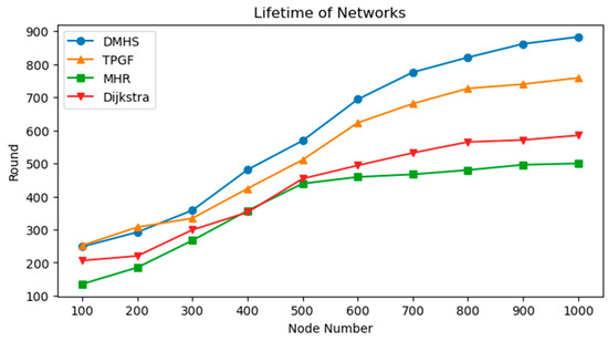 The minimum energy threshold for nodes to enter protected mode has been set at 10%. While in this mode, nodes are only permitted to send original data and are not capable of forwarding any packets. To determine the average lifetime of networks, which is the rate at which nodes die off by 50%, we analyzed the results of 100 simulations using 100 different random seeds for network deployment. We varied the number of nodes from 100 to 1000 to obtain distinct values. The comparison of the lifetime achieved by the four algorithms is displayed in Figure 6.