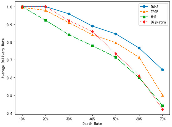 The DMHS algorithm demonstrates improved average delivery rate performance as the network expands, with this advantage becoming more prominent when the death rate is between 50% and 70%. This is attributed to the algorithm’s ability to recursively explore other nodes by adjusting its hop count when a route is lost, as long as there is only one connected route to the sink. In contrast to traditional algorithms, the DMHS algorithm overcomes limitations such as becoming stuck in local optimal solutions and slower convergence. Consequently, it can be inferred that the DMHS algorithm exhibits reduced energy consumption and a high level of robustness.