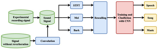 When indoors, reverberation from the internal structure of a house can alter the original sound signal, creating delays and causing the distortion of the corresponding features. Most of the datasets used to train sound classification models do not have reverberation effects. Therefore, the models trained from these datasets will be less accurate when applied to indoor environments. We therefore considered the indoor application of hearing aids and active noise-canceling headphones and set our classification targets as music signals, specifically instrumental music, song signals that contain both instrumental music and human voices, and speech signals that contain only human voices.