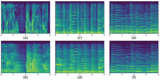 The effect of reverberation on the STFT spectrogram. (a,b) are the spectra of the speech signal without and with the reverberation effect, respectively. (c,d) are the spectra of the song signal without and with the reverberation effect, respectively. (e,f) are the spectra of the music signals without and with the reverberation effect, respectively.