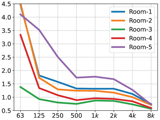 The DIRAC room acoustics software and its accompanying equipment were used to measure the reverberation time; the sound source was a firing gun. Table 2 shows the main instruments used in the experiments, as well as the software. The experimental procedure was as follows: the measurement personnel holding the firing gun held the gun above their heads at a distance of approximately 2 m from the horizontal plane. The measurement points were greater than 1 m from each reflecting surface. In total, the impulse responses were recorded in five rooms, and their corresponding reverberation time curves are shown in Figure 7.