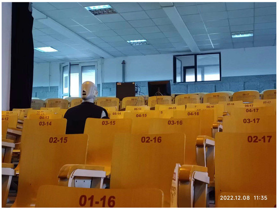 As shown in Figure 8, the measured impulse responses were convolved with the clean signals in the time domain to obtain signals with reverberant characteristics. Figure 9 was taken in the field experiment, and the instruments shown are the sound quality head and torso simulator. The dataset consists of the signals recorded in the hall and the signals obtained from the simulation; both types of signals were included to make our dataset more diverse.
