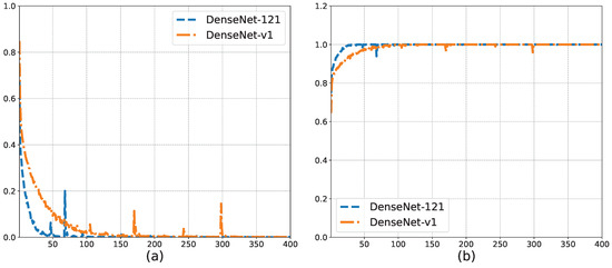 Comparison of the training process before and after DenseNet modification. (a) Training loss. (b) Training accuracy.