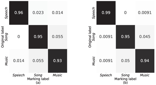 As seen in Figure 5, the special structures of song and speech signals are blurred due to the effect of reverberation, and the energy of each frequency band becomes longer in the time domain and appears to be shaped similarly to music signals from an intuitive visual point of view.