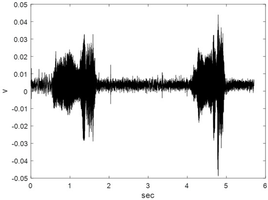 Figure 2, Figure 3 and Figure 4 show the start and end times of Class I, II, and III HWV samples, which provides a visual sense of these samples. As shown in Figure 2, the start and stop times of samples 1 and 2 for the Class I HWVs, were, respectively, 0.6870–0.7042 s and 0.7043–0.7215 s; they were 1.5977–1.6149 s and 4.8793–4.8965 s for the Class II HWVs (Figure 3) and 0.6700–0.6872 s and 0.7388–0.7560 s for the Class III HWVs (Figure 4). The maximum and minimum amplitudes of the samples for the Class I HWVs were 0.015 V and −0.005 V, respectively. They were 0.010 V and −0.005 V for the Class II HWV samples and 0.015 V and −0.005 V for the Class III HWV samples. Figure 2, Figure 3 and Figure 4 illustrate the wave structure, vision insight of the Class I, II, and III HWV samples, and the amplitude changes with time. Figure 2, Figure 3 and Figure 4 show that Class I, III, and II HWV samples exhibit the fastest, second, and slowest oscillation phenomena (frequencies), respectively, from visual analysis.