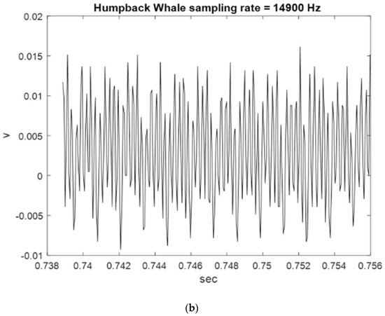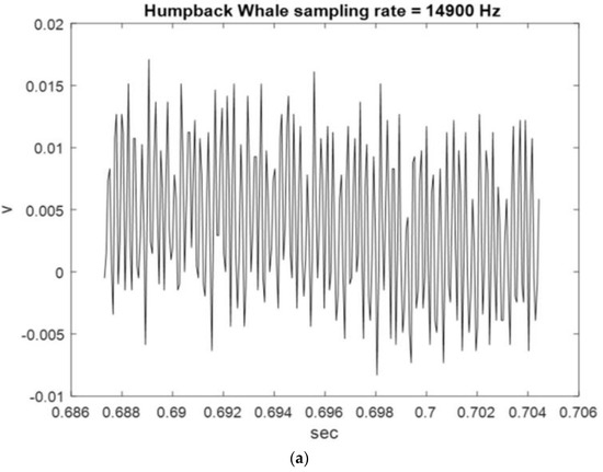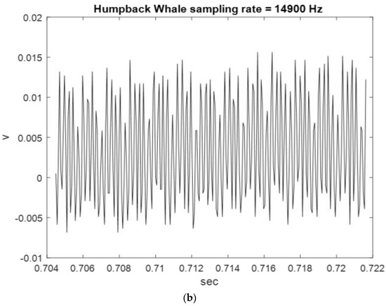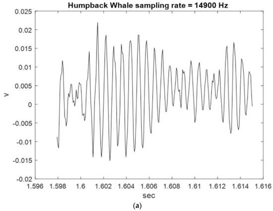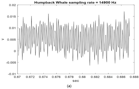 Frazer et al. [20] found the frequency range of humpback whale vocalization (HWV) to be from 20 Hz to 8 kHz, whereas Au et al. [21] reported that the high-frequency harmonics of HWV songs extended beyond 24 kHz. Mature male HWVs produce elaborate acoustics in low-frequency bands of 0–1.5 kHz. Daily root-mean-squared sound pressure levels can be calculated to compare variations in low-frequency acoustic energy and monitor the population of HWV [22]. Male HWV presents long, structured sequences of acoustic vocalization, and the frequency distributions of the mean pulse-repetition rate can reach 3.97 kHz. Male HWV songs have a minimum frequency below 400 Hz and a maximum frequency above 3 kHz but below 8 kHz [23]. The songs are loud and of long duration; they are produced in the frequency range of 8 Hz–8 kHz, last from several minutes to hours, and have been noted to be frequency and amplitude modulated [24]. Angela et al. [25] examined the non-song vocalizations of HWV frequencies, which vary from 9 Hz to 6 kHz. The frequencies of the majority of vocalizations were under 200 Hz, and the duration of non-song vocalizations was found to be between 0.09 and 3.59 s.