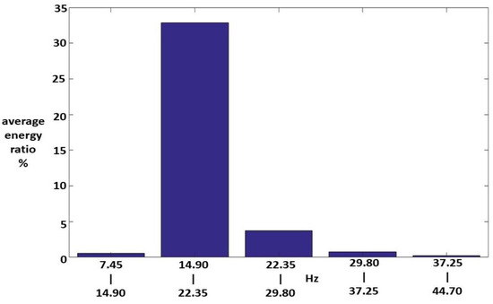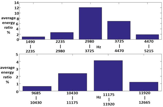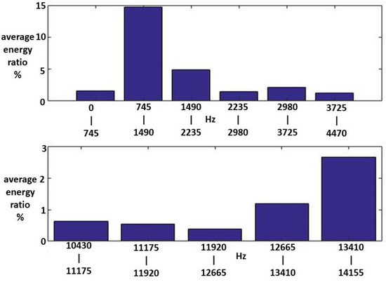 Among these, the energy distributions of IMF1, IMF2, and the RF were important. Figure 8, Figure 9 and Figure 10 show the average MSs of IMF1, IMF2, and RF. The average energy ratios of IMF1 in the high-frequency bands of 1.490–2.235, 2.235–2.980, 2.980–3.725, 3.725–4.470, 12.665–13.410, and 13.410–14.115 kHz were 14.68%, 4.91%, 1.50%, 2.18%, 1.23%, 1.20%, and 2.66%, respectively. The average energy ratios of IMF2 in the high-frequency bands of 0.745–1.490 and 13.410–14.115 kHz were 18.99% and 2.84%, respectively. The average energy ratio of RF in the low-frequency bands of 14.9–22.35 Hz was 21.63%.