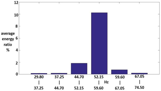 Sixteen Class III HWV samples were analyzed. Sample 1 from this class was adaptively decomposed into six IMFs and one RF using the EMD method. As for the other classes, the number of IMFs depended on the input Class III HWV samples. The mean IFs of IMF1-IMF6, and RF for Class III HWV sample 1 were 5.720, 2.890, 1.445, 0.330, 0.245, 0.141, and 0.038 kHz, respectively. The average mean IFs of IMF-IMF6, and RF for Class II HWVs were 5.422, 3.153, 1.407, 0.475, 0.242, 0.138, and 0.040 kHz, respectively. The average , , , , , and , were 34.29%, 2.48%, 3.04%, 1.57%, 4.47%, and 15.80%, respectively, and the average was 38.33%. Among these, the energy distributions of IMF1, IMF6, and the RF were important. Figure 11, Figure 12 and Figure 13 show the average MSs of IMF1, IMF6, and RF. The average energy ratios of IMF1 in the high-frequency bands of 1.490–2.235, 2.235–2.980, 2.980–3.725, 3.725–4.470, 4.470–5.125, 11.175–11.920, and 11.920–12.665 kHz were 1.02%, 2.70%, 12.06%, 6.89%, 1.84%, 4.10%, and 1.20%, respectively. The average energy ratio of IMF6 in the low-frequency bands of 52.15–59.60 Hz was 10.24%. The average energy ratios of RF in the low-frequency bands of 14.9–22.35 and 22.35–29.80 Hz were 32.83% and 3.73%, respectively.
