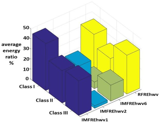 Figure 14 shows that the average values of and for the Class I, II, and III HWV samples were higher than 10%. The average values of for the Class I, II, and III HWV samples were 46.37%, 32.06%, and 34.29%, respectively. The average values of and for the Class II and III HWV samples were 29.22%, and 15.81%, respectively. The average values of for the Class I, II, and III HWV samples were 34.20%, 22.64%, and 38.32%, respectively. Those results reveal a new characteristic view of significant IMF-based energy distribution.