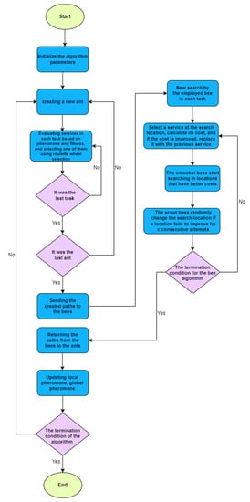 Due to too many intensifications by the OBees, ABC’s convergence is accompanied by a delay, and on the other hand, ACO during intensification has stagnation. Ants create the initial set of solutions, and the routes are handed over to bees for exploitation to tackle these issues in the proposed AC-ABC hybrid algorithm. The advantages of the ACO and ABC algorithms are hybridized and synergized in the proposed algorithm. In the proposed algorithm, ants create paths that combine optimal services. These services are, in fact, the initial food sources for the bee colony. When sources are given to ABC, the EBees search the services, their neighborhoods, and the information sent to the OBees. The OBees tend to be the food source with higher quality (fitness), so solutions with higher fitness will have more chances of being selected by the OBees. Then the scout bees replace the exhausted food sources with new, random ones. Bee-optimized food sources are given to ants as their path to updating pheromones based on a fuzzy inference system. In the next iteration, ants will tend to follow paths with more pheromones. Finally, the algorithm will halt when it reaches a predetermined number of iterations. The comprehensive explanation of the suggested algorithm and the equations included are considered below: