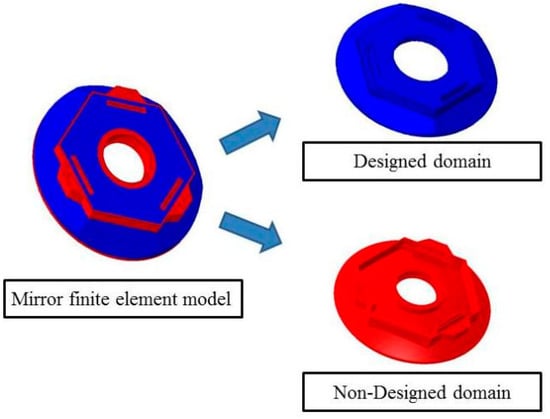 The initial finite element model of the mirror was divided into a design domain and a non-design domain. The non-design domain was retained on the mesh, where the material could not be removed. It included the mirror connection interface, the back square slot, the part around the central vent and the mirror surface. For the design domain, the topology was optimized. The design domain and Non-design domains is shown in Figure 2.