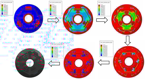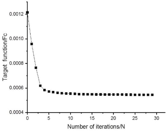 In the equation, the objective function is represented by . The mirror external load is represented by F, i.e., 1 G gravity along the Z-axis. The volume variable is represented by . The mirror initial structural volume and volume minima are represented by and , respectively. and are the initial peak and valley values of surface accuracy as well as the peak and valley minima of surface accuracy in the constraints, respectively. After iterative calculation, the topology optimization process of the mirror and the iterative curve of the objective function are as shown in Figure 3 and Figure 4.