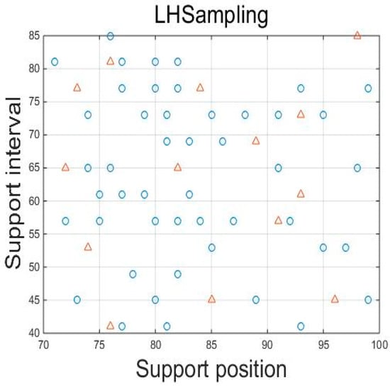 A small selection of samples within the mirror’s support parameter sample space was used as the original sample for building the Kriging model for the optimal design of the mirror’s structure. The accuracy of the subsequent Kriging surrogate model of the mirror was strongly influenced by the original sample. Therefore, the selected samples were required to be representative, as well as randomly and uniformly distributed throughout the sample space. Considering the high computational cost per sample, the number of samples selected had to be kept within a certain range. In this thesis, 48 samples were selected in the support parameter sample space as the original samples for building the Kriging surrogate model. The support position ranged from 71 mm to 99 mm, accounting for 50% to 70% of the maximum radius of the mirror. The support interval ranged from 41 mm to 85 mm, taking into account the assembly constraints of the whole machine and the machining process. The Latin hypercube sampling is shown in Figure 6.