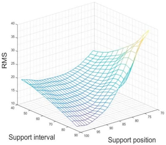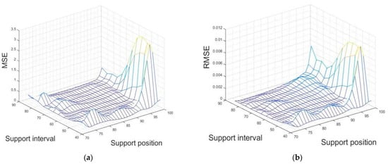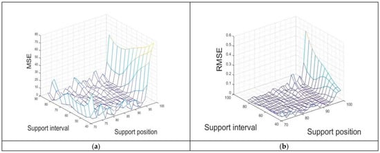 The samples to be tested that were not identified accurately were (82,65), (93,61), (96,45) and (85,45). According to Figure 8, the Kriging surrogate model of the created mirror had a large RMSE at all the above locations. Therefore, the surrogate model do not have a high prediction precision. Although the recognition precision was only 72%, the difference between the recognition result and the true value of the sample to be tested (the actual support position and support interval) was small in the samples to be tested that were not identified accurately. The incorrectly identified support parameter was found to be at the second- or third-smallest distance (when the smallest value obtained from was the same as the support parameter to be measured and the parameter was correctly predicted), as shown by the ranking of the distance between the measured value and the predicted value of the surrogate model from smallest to largest.