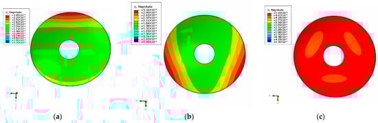 The mirror is not consistent in the direction of the optical axis during operation, which is different from the structural optimization design. In the static analysis of the mirror, it is necessary to apply the load in the X-, Y- and Z-directions in order to fully reflect the deformation of the mirror surface and to evaluate its performance. The mirror finite element model was established using ANSA software. The constraints were set to full degrees of freedom and applied to the screw connections to simulate the actual environmental conditions. ABAQUS software was used to carry out the finite element analysis of the mirror under the three load conditions. The optical surface deformation cloud picture is shown in Figure 11. The mirror and its support structure were also made of aluminum alloy to allow for an integrated thermal dissipation and non-thermal design, so that thermal analysis was not simulated separately.