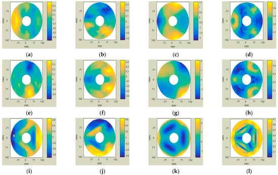 Optical surface for removal of rigid body displacement by gravity in the X-, Y- and Z-directions of the mirror. (a) Slope X Map (The X-direction is affected by gravity); (b) Slope Y Map (The X-direction is affected by gravity); (c) Surface Map (The X-direction is affected by gravity); (d) Slope Magnitude Map (The X-direction is affected by gravity); (e) Slope X Map (The Y-direction is affected by gravity); (f) Slope Y Map (The Y-direction is affected by gravity); (g) Surface Map (The Y-direction is affected by gravity); (h) Slope Magnitude Map (The Y-direction is affected by gravity); (i) Slope X Map (The Z-direction is affected by gravity); (j) Slope Y Map (The Z-direction is affected by gravity); (k) Surface Map (The Z-direction is affected by gravity); (l) Slope Magnitude Map (The Z-direction is affected by gravity).