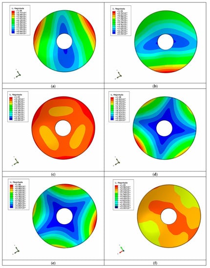 Based on the above principles, the mirror finite element model was modeled by applying boundary conditions and setting the solution type. The first six orders of modal vibration, along with their specific values, are shown in Table 7 and Figure 13.