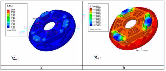 Cloud picture of the primary mirror three-way 20 g overload stress and displacement: (a) Cloud picture of X-direction impact stress; (b) Cloud picture of impact displacement in X-direction; (c) Cloud picture of Y-direction impact stress; (d) Cloud picture of impact displacement in Y-direction; (e) Cloud picture of Z-direction impact stress; (f) Cloud picture of impact displacement in Z-direction.