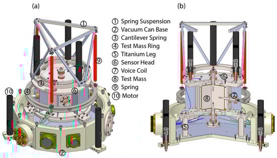 A perspective view of the hardware, encompassing the sensor head, springs, suspension, motors, and the lower section of the vacuum can. Notably, the representation intentionally excludes the cover of the vacuum for clarity and simplification. (a) The comprehensive depiction of the hardware assembly. (b) The 120-degree sectional view unveiling the internal components and structure of the instrument. Six screws are affixed to the test mass, each aligned along one of the three orthogonal axes. With magnets inside the screws and solenoids around the magnets, voice coils are formed and can be used for feedback.
