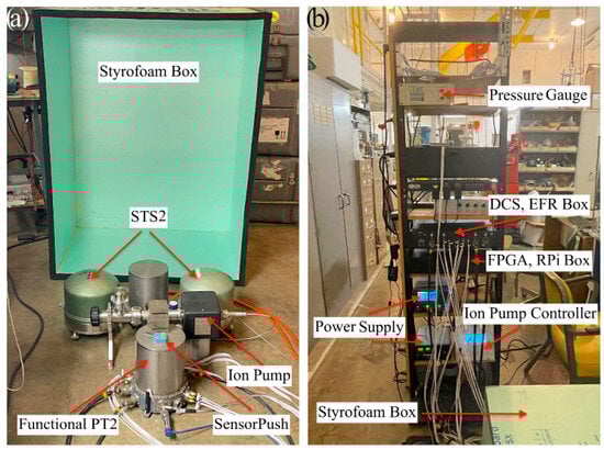 (a) Experimental setup showing the raised Styrofoam box, STS-2 and PT-2 seismometers, ion pump, SensorPush® and vacuum plumbing. (b) Electronics rack showing the lowered Styrofoam box, power supplies, pressure gauge, EFR and FPGA boxes and ion pump controller.