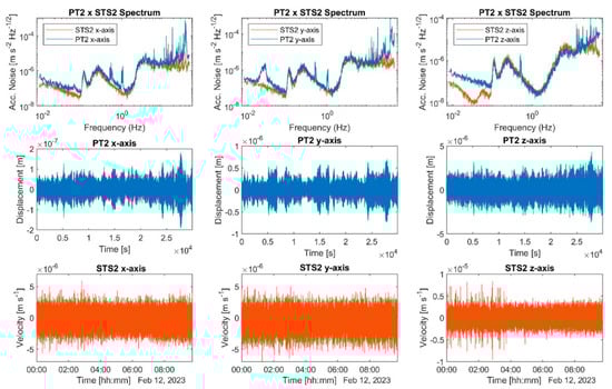 All three axes reached about the same noise floor at low frequencies. Although the main cause for this remains unclear, it is suggestive that all three axes are limited by the same 1/f noise at present. The PT-2 horizontal axes displayed better noise agreement with the STS-2 than the vertical axis. However, it is important to highlight that the vertical axis of the STS-2 seismometer exhibits greater sensitivity compared to its horizontal axes.