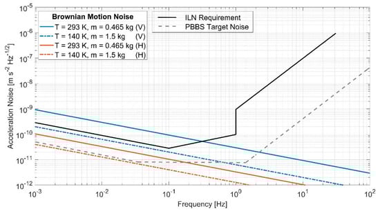 Substituting Equation (7) into Equation (4), we calculate the Brownian motion noise for the vertical axis at f = 1 mHz for two different sets of T and m: