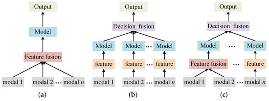 The process of feature-based fusion is shown in Figure 1a. Feature-based fusion usually involves extracting features from different modalities and then fusing them directly, which is suitable for cases where there is a high correlation between modalities. Yang et al. [33] used feature-level fusion for audio and video features for speech recognition, but it suffers from the deficiency of challenging feature extraction. Besides deep learning-based feature extraction, the fuzzy inference method and generative rule method are standard methods for feature-level fusion. The generated high-dimensional feature vector limits feature-based fusion, and the method cannot model complex relationships because of the difficulty in obtaining the cross-correlation between different features by directly fusing multiple modal features.