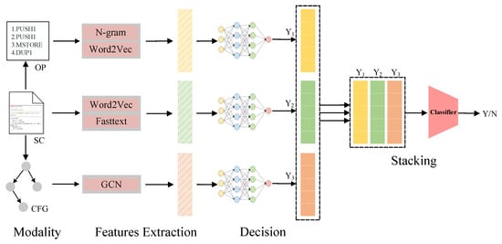 The overall structure of the proposed approach is shown in Figure 2, and the whole process is divided into subclassifier learning and multimodal decision fusion. The subclassifiers make decisions based on the characteristics of the different modalities of the smart contract and determine whether there is a vulnerability. On the other hand, multimodal decision fusion takes each subclassifier’s decision output as input and learns decision fusion strategies based on the decision output and the true labels.