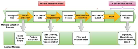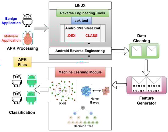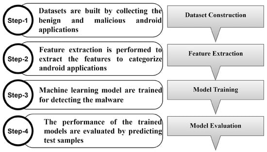 The essential key aspects of Android are its use as a broadcast receiver and content provider. A broadcast receiver is used for sending the data amongst the various applications. This is used by the malware developers that can track the activities that contain sensitive information [15]. It refines, receives, and responds back to the departing broadcasts which later permits the Android applications to have the capability to respond to external activities like receiving text messages or audio/video calls, while the content provider helps the Android malware exchange the data for seeking permission to execute the malicious behavior [1]. These permissions and the key aspects used in building the Android application are required to be registered in the AndroidManifest.xml file, which is mostly deployed as the auxiliary indicator to be incorporated with other analysis techniques for the prediction of malware. The various steps to detect the Android malware in machine learning are shown in Figure 1.
