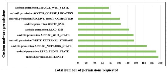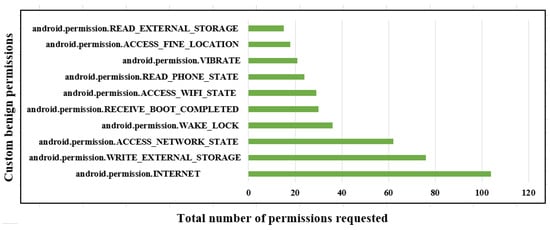 The results obtained permit us to obtain insights regarding a comparison between the permissions used by the malware and the benign applications, as shown in Table 1 and Figure 5 and Figure 6.