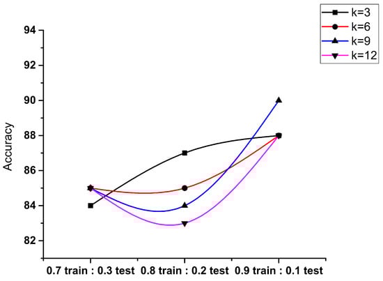 We performed four tests with numerous configurations. In Figure 8, we have taken four values of K, i.e., 3, 6, 9, and 12. Three configurations presented samples of 0.7, 0.8, and 0.9 as training data and 0.3, 0.2, and 0.1 as testing data, which had been taken into account for the evaluation of metrics. The accuracy for detecting the Android applications with k = 9 depicts the maximum accuracy having the ratio of 0.9 and 0.1 that shows 91.5%. This means that with k = 9, the detection of Android applications is more accurate compared to the 0.7:0.3 and 0.8:0.2 results.
