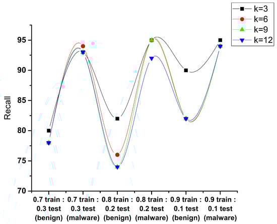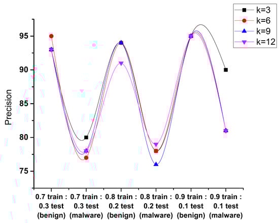 The precision is the total positive predictions for the benign and malware classes. When the samples in Figure 9 were taken as 0.7 and 0.3, the maximum precision came out for the value of k = 3, k = 12 gives the minimum precision for the benign class, and k = 12 gives the minimum precision for the malware class as compared to other values. The samples 0.8 and 0.2 for a benign class give the maximum and minimum precision at the values k = 3 and k = 9, respectively, and for the malware class, the maximum and minimum precision are at the values k = 3 and k = 12, respectively. The results show that when the sample is taken as 0.9 and 0.1, then the precision is achieved with good results.