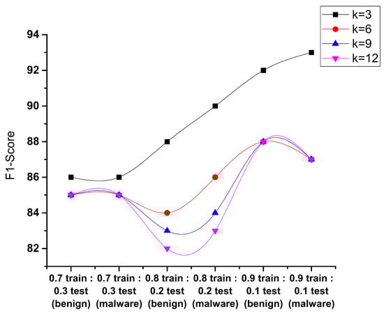 The f1 score in Figure 11 is defined as the Android detection malware that is deployed to identify the attack made when the permissions were extracted, and this shows that the 0.9:0.1 sample test gives the best results for benign and malware classes. The f1 score to be achieved with k = 3 gives the maximum f1 score, i.e., 93% compared to the other given samples.