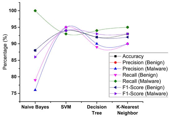 In this section, the evaluation of the proposed framework for Android malware detection is examined. The performance evaluation of the model is proposed using the accuracy and other metrics for the different values of k [30]. The accuracy, precision, recall, and f1 score for the proposed model on the prediction and recommendation of malware are discussed in Section 4.1. The flowchart of Android malware detection is described as the dataset, gathering the Android applications packages from the numerous repositories i.e., APK files, and then recognizing the different classes of .apk files to verify whether the class is benign and malware, later extracting the Android permissions and API calls from .apk. The set of features is selected by using the feature selection approach [31]. The selected set of features is trained with different machine-learning models, and finally, we developed a KNN model which validates by using the existing frameworks.