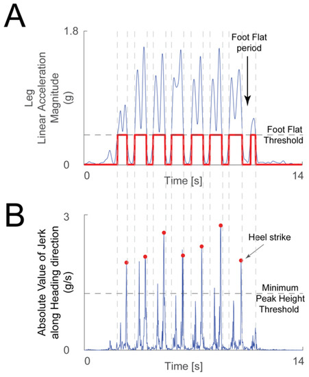 Heel strike detection method. (A) The linear acceleration magnitude from the leg IMU (blue trace) was used to determine periods when the foot was flat on the floor—when the acceleration was below the foot flat threshold (gray dashed line), and periods where the foot was moving—when the acceleration magnitude was above the threshold (chosen manually for each recording). The logical signal that highlights the foot flat periods is shown in red. (B) A peak detection algorithm was used on the absolute value of the jerk signal along the heading direction (blue trace) during the periods when the foot was moving. Toe off and heel strike events create large peaks in the jerk signal during a period of significant foot movement. When the algorithm found more than one peak larger than the minimum peak height threshold (gray dashed line, chosen manually for each recording) in one period, the second peak was chosen as heel strike (red dots).