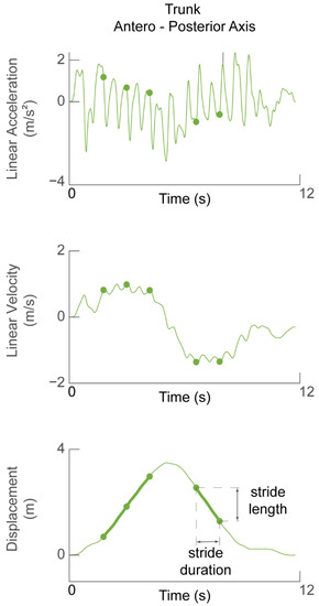 The stride length was calculated as the difference in the forward displacement of the trunk at the end of the stride with respect to the beginning (Figure 3, bottom panel). The stride speed was calculated as the ratio of stride length to stride duration. The walking speed was defined as the average of the speed of the stride cycles selected for analysis (i.e., straight walking).