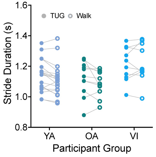 Pairwise comparison of stride durations between the TUG (disk) and walking (circle) tasks for each participant in the younger adult (YA), older adult (OA), and visually impaired (VI) groups. There was no significant difference in stride duration between tasks for all groups.