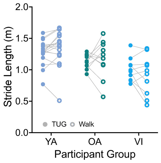 Pairwise comparison of stride lengths between the TUG (disk) and walking (circle) tasks for each participant in the younger adult (YA), older adult (OA), and visually impaired (VI) groups. There was no significant difference in stride length between tasks for all groups.